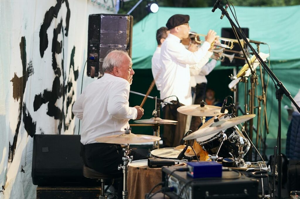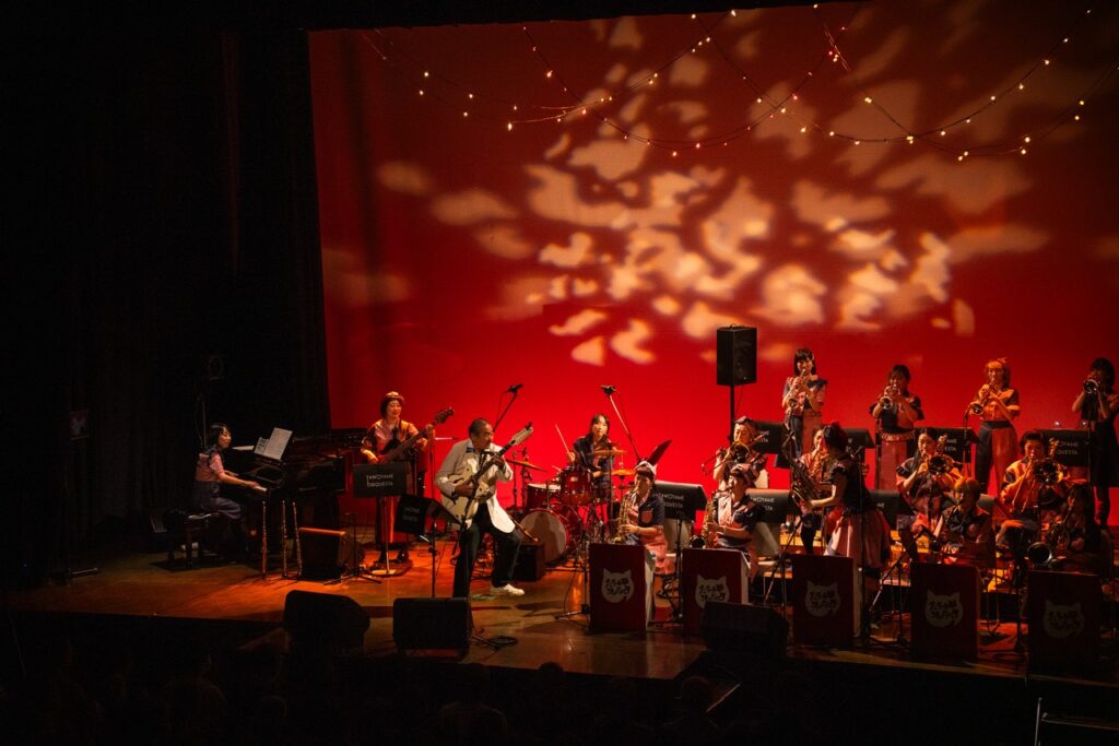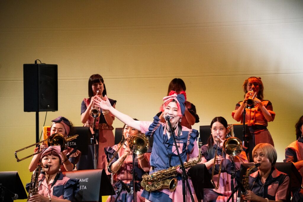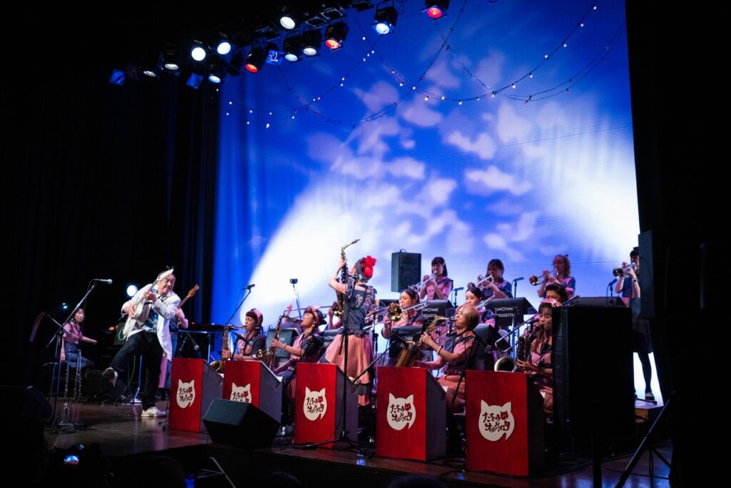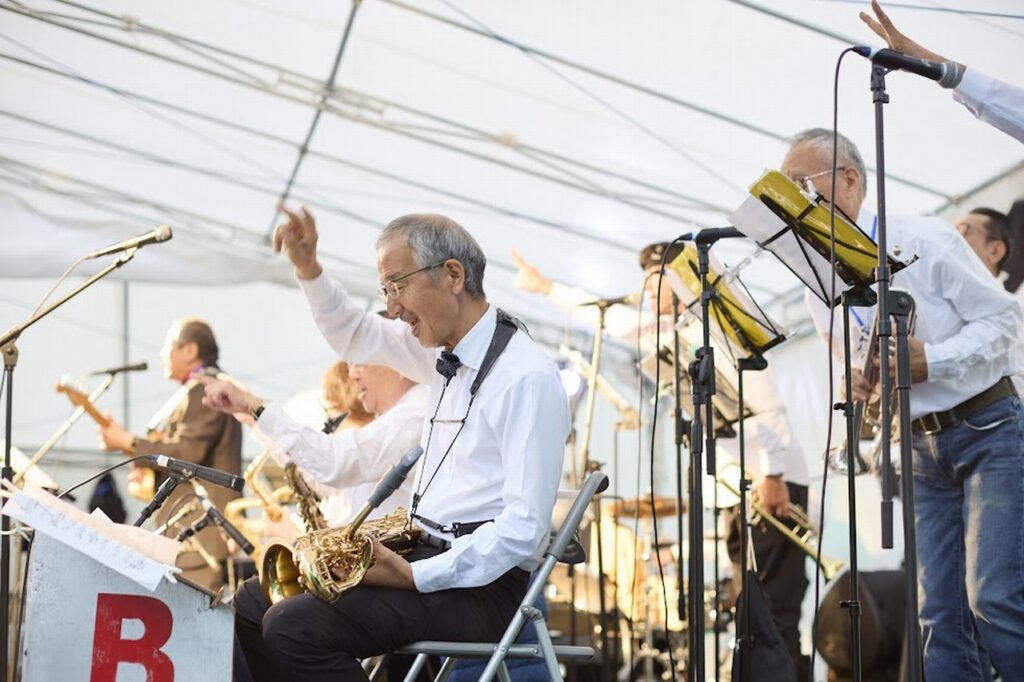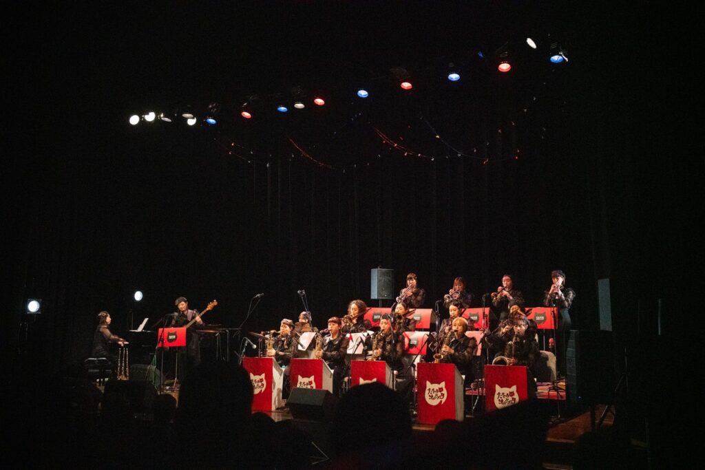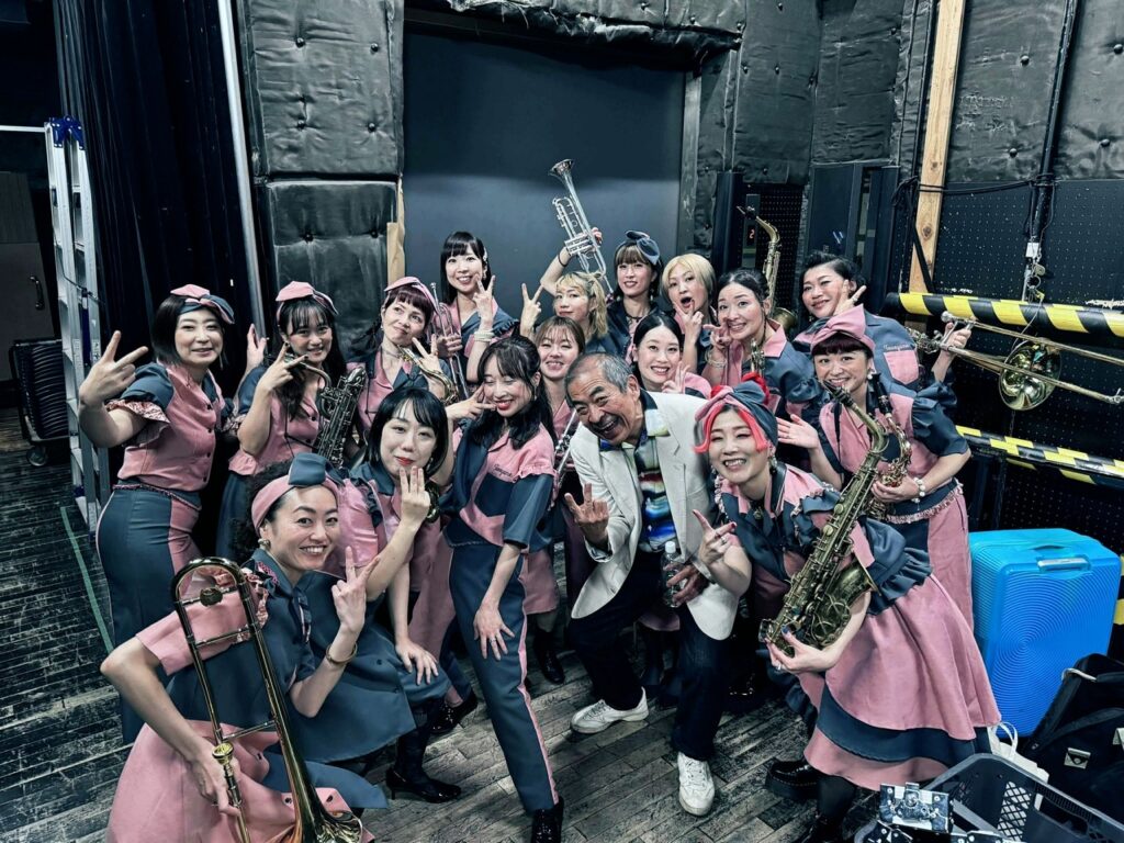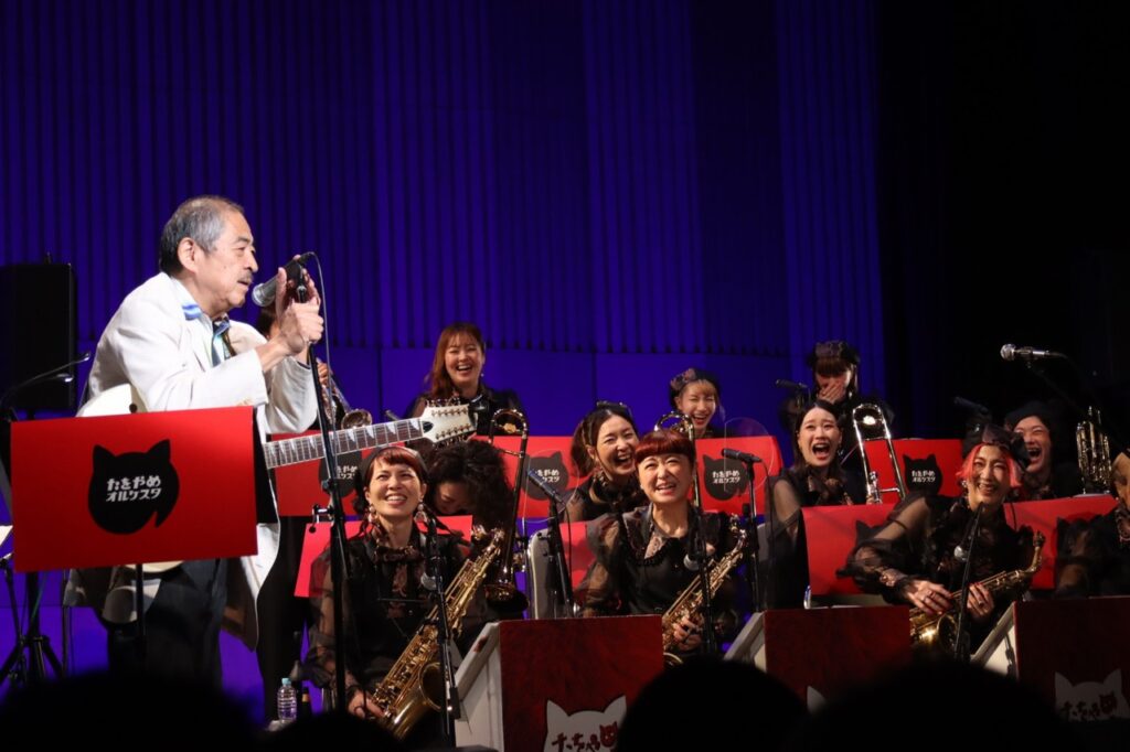 曲としてはBoppersの「最後まで楽しもう」と「高田馬場」をこの大編成で演らせていただきまして、ええ、岡村ちゃんもあの高田馬場近辺の大学に行ってたんだー、みたいな話になって盛り上がりつつ先輩風も吹かせつつ、で、一旦全員のコーナーはお休みして、5曲ほど3~4管の小編成で昼の軽音楽、みたいな感じで洋楽コピーものを演らせていただきました。そして再び全員登場していただいて数曲。