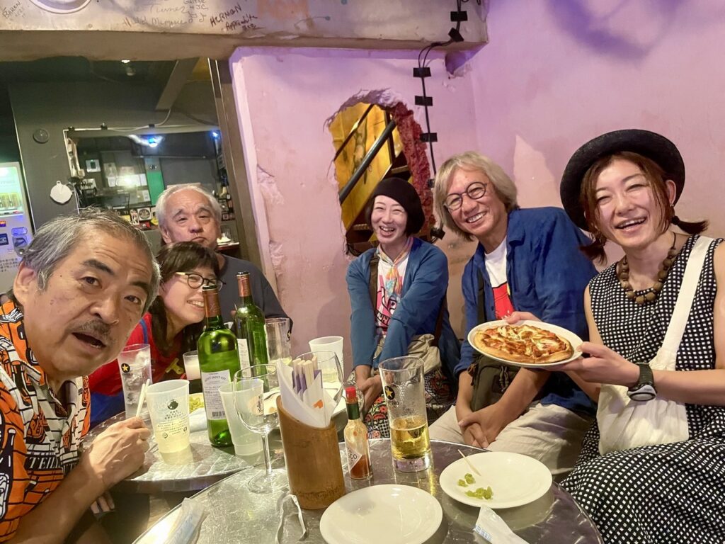 急遽、バンバン号は車屋さんに行くことになり、合流はかなわず、代わりに急遽P作さんのバンド、PANTS’EXのパーカッションの方に車で空港まで迎えに来て頂くことになりました。ありがとうございました。別府に入りチェーン店の資さんうどんで昼飯を食べていたところでバンバン号とも無事合流し、会場のカッパーレイヴンスに到着。