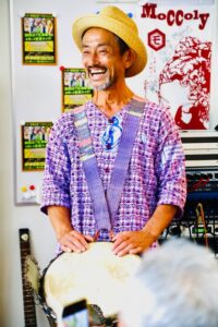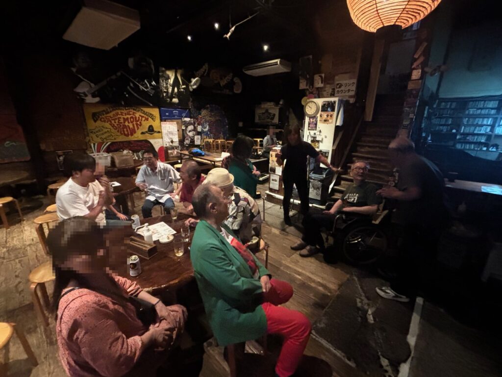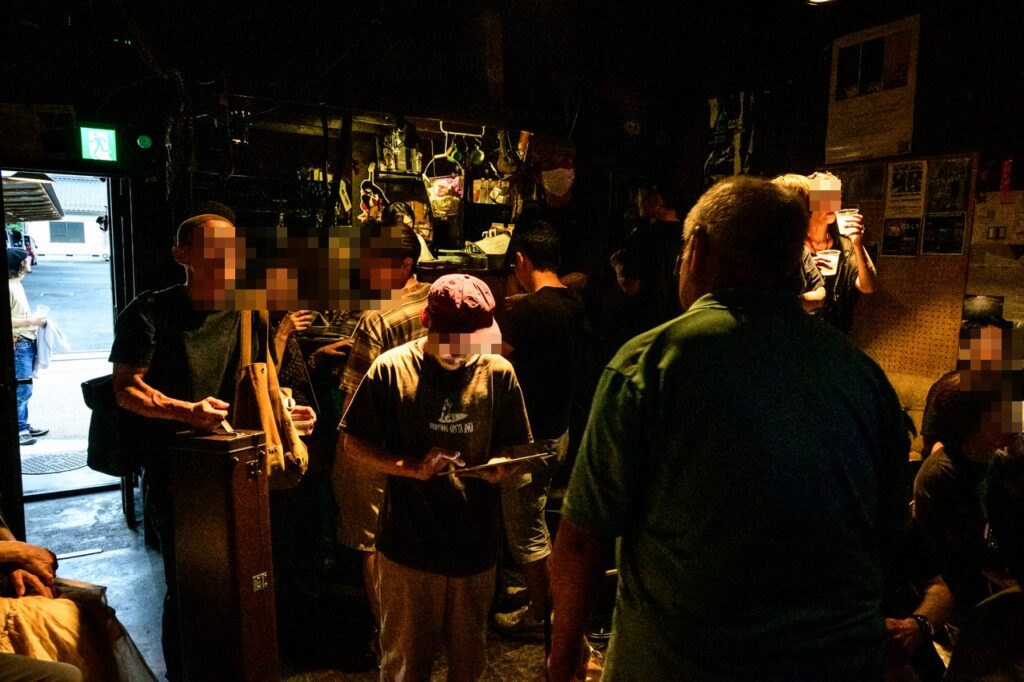 そして看板の右下に追加で書かれている様に、こちらもお初にお目にかかる山田さんという方と鈴木さんという方も来られることになりまして、なかなかにぎやかな午後になりそうな感じです。昼過ぎからのリハを終えて近所の立ち飲み屋でシャッフル・マシーンのお二人と、博多ブルース・シーンの現状や日本におけるブルース縦社会の歴史、などと言った濃密な情報交換を済ませてから、ライヴはスタート。