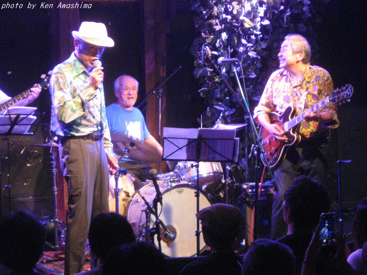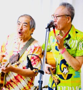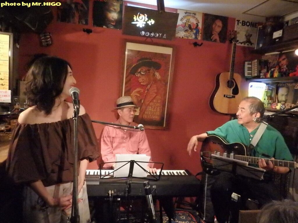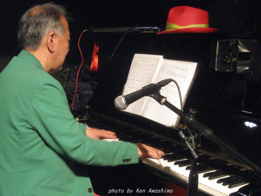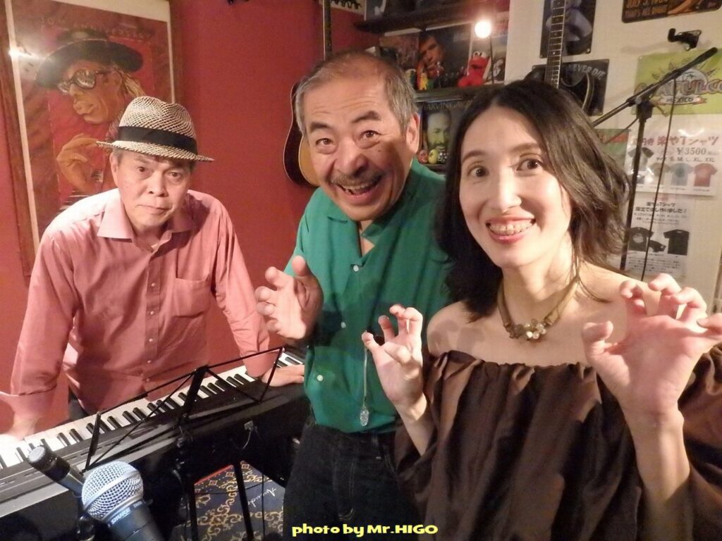 写真は笑顔でご機嫌、とも見えますが、実際は途中でどこを弾いているか判らなくなってガチャガチャになってしまい、苦し紛れで笑っているのです。そして再び吉森さんに加わっていただき、曲の前半は吾妻が唄い、後半になって白崎さんに出てきていただく、という演出。