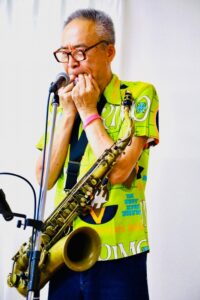 吾妻は亡くなった小出さんにちょっと想いを寄せて、彼の好きだったロバート・ナイトホウクの”Moon Is Rising”を唄いましたが、ギターの代わりにハープを吹いて客席を回りました。