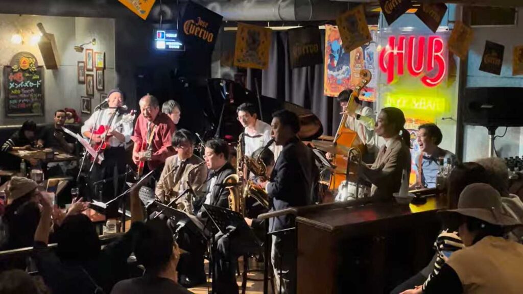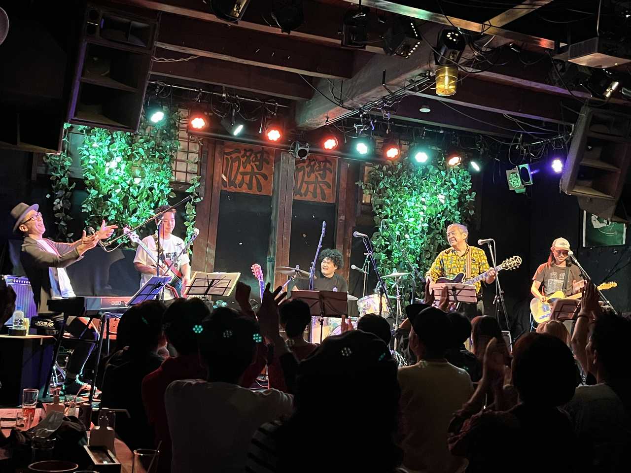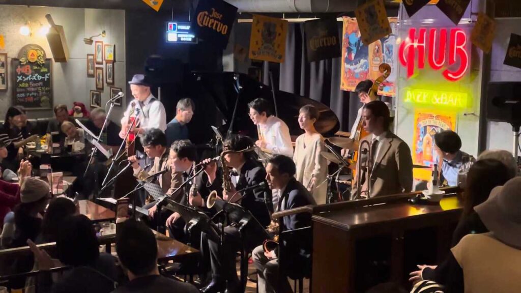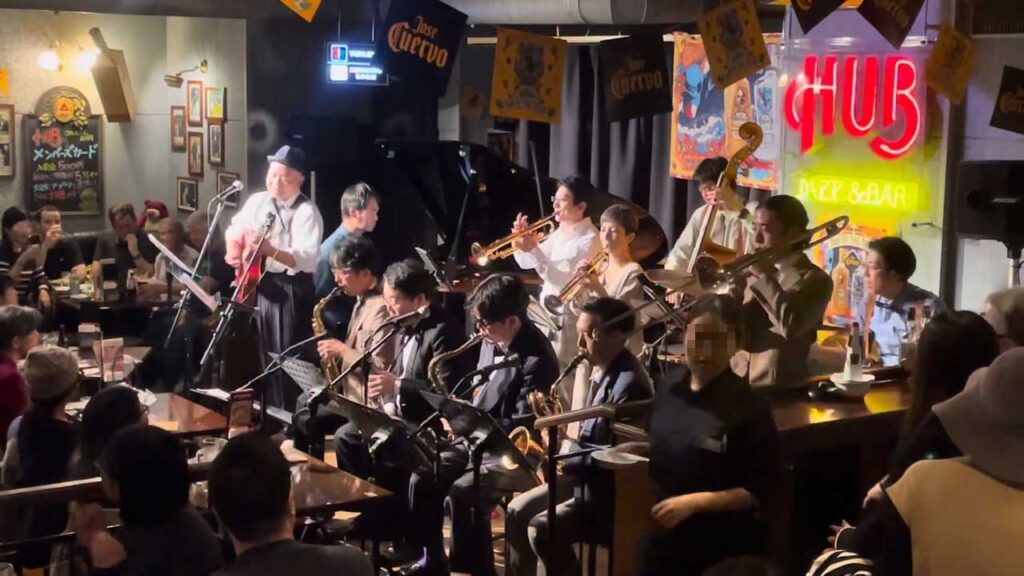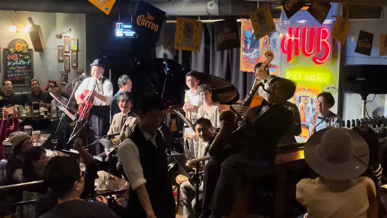 阿佐谷ジャズではアルトの斉藤さんにお世話になりましたが、弊楽団が同じぐらいお世話になっているのが、東京のもう一つのジャンプ・ビッグ・バンド、富山君率いるドリンキン・ホッピーズでありまして、あ、あと関西の井尻君率いるルーズ・ヘップキャッツにもお世話になってますが、ともかくコロナの時などは本当に代打の方々に何度も手伝って頂きました。そんな彼らの浅草HUBでのライヴにゲスト参加してほしい、ということで加えて山登りの準備でもお世話になっていますし、これは断れるわけがありません。近隣でたしなんだ後、第一部は彼らだけのステージ。