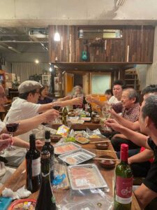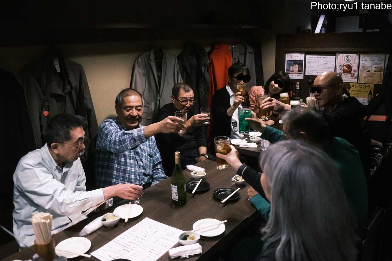 この写真、何十年か後になって懐かしく思い出したりしてくれるのでしょうか?それとも翌日にはゴミ箱行きだったのでしょうか?この先多分、絶対判らないことがある、というのも人生においてはなかなか味わい深いものです。ということで、良く来て頂いている皆さんなどとも一緒に少しでも安い居酒屋を、と二日間かけて探した店に行って打ち上げタイム。
