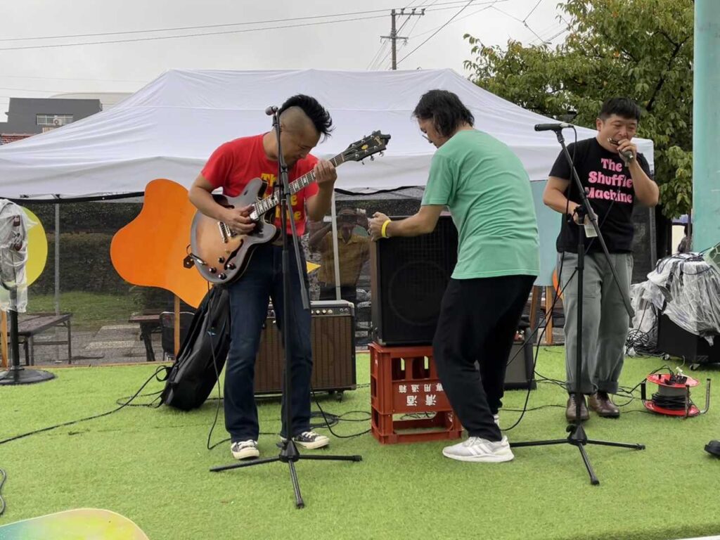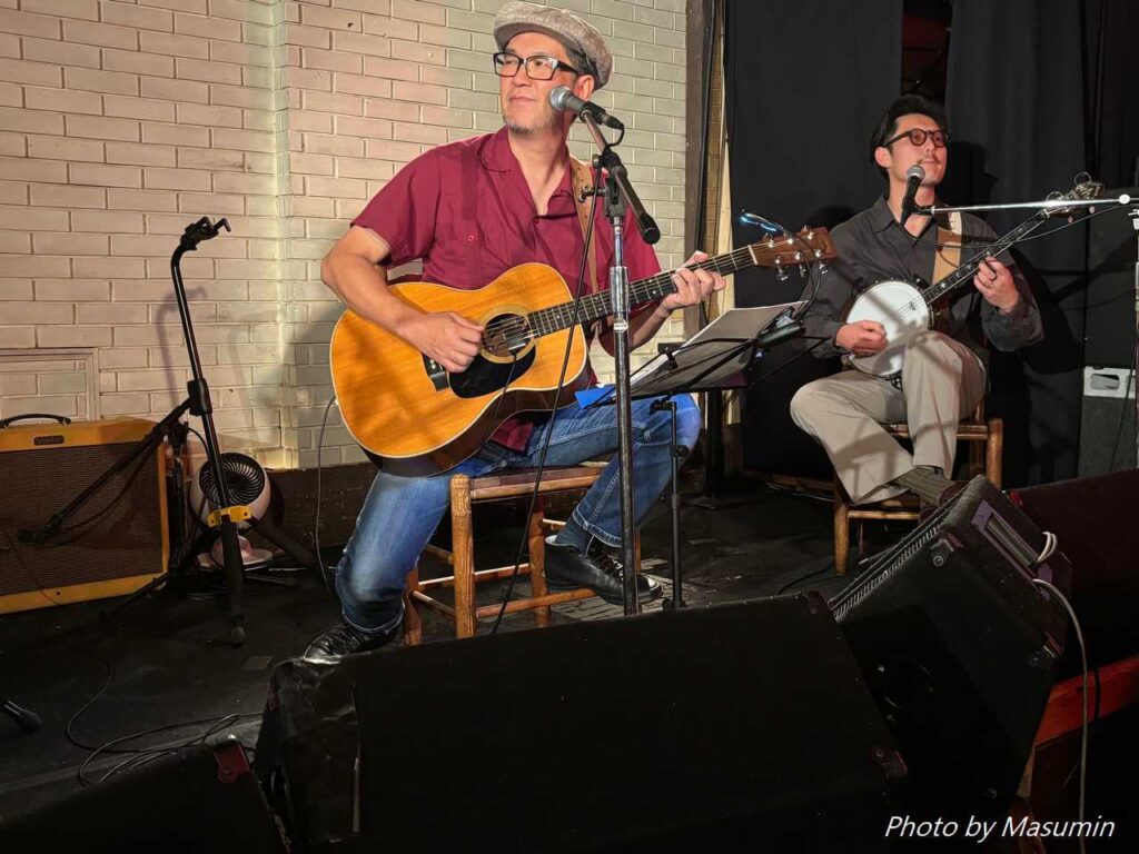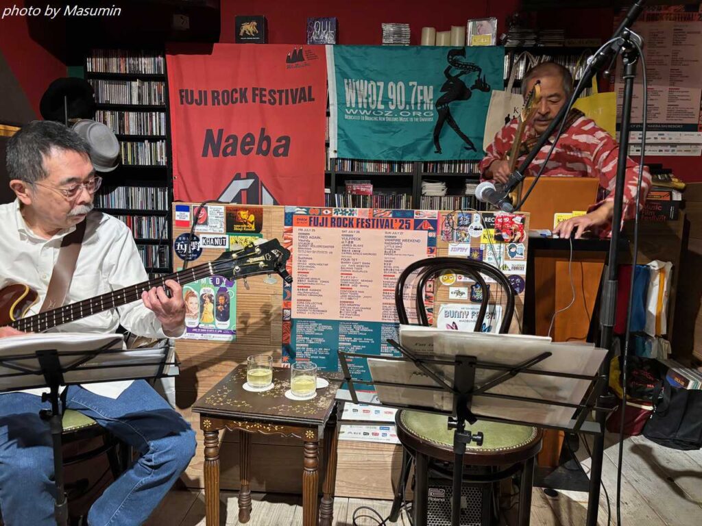 マタギ風(?)の衣装と不安を煽る様な斜めの画角もあいまって、何とも神秘的な感じの写真ですが、唄っている題材はそんなに神秘的ではなく、最近注力しているブルース浪曲はジョン・リー・フッカー北陸公演の放浪の一幕、でした。そしてカラス氏のステージの最後にコージーが加わりました。