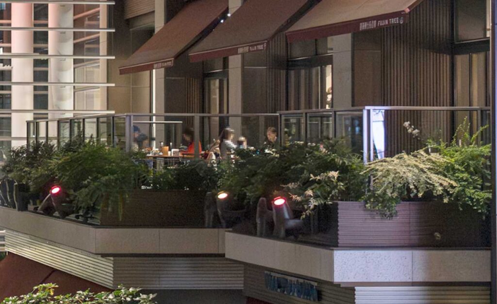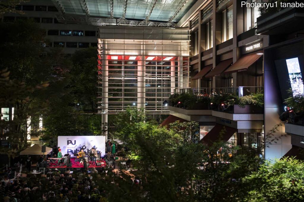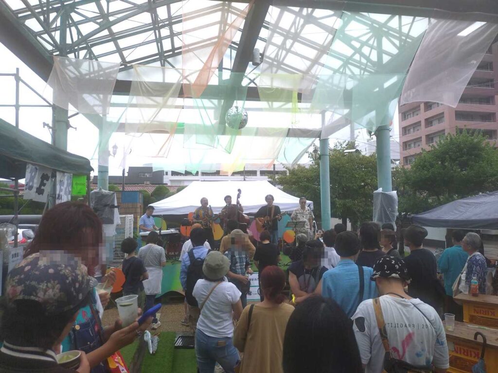 何ということはない、右上のテラスの方々は催しとはまったく関係無くお食事をされているだけでした。丁度、我々のステージの直前でステージ前の有料席エリアが入れ替わりの時間だったので、このタイミングを利用してサウンドチェックを行いました。