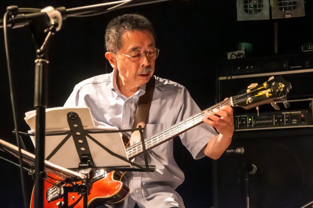 約43年ぶり、という再会でしょうか。山田さんは当時の面影はありませんが、すっかり渋みのあるジャズ・ギター奏者になられておりました。そんなこんなの意外な展開もあり、終盤にはT・ボーン・スタイルで店内をうろついたりしてセッションは楽しく終了しました。