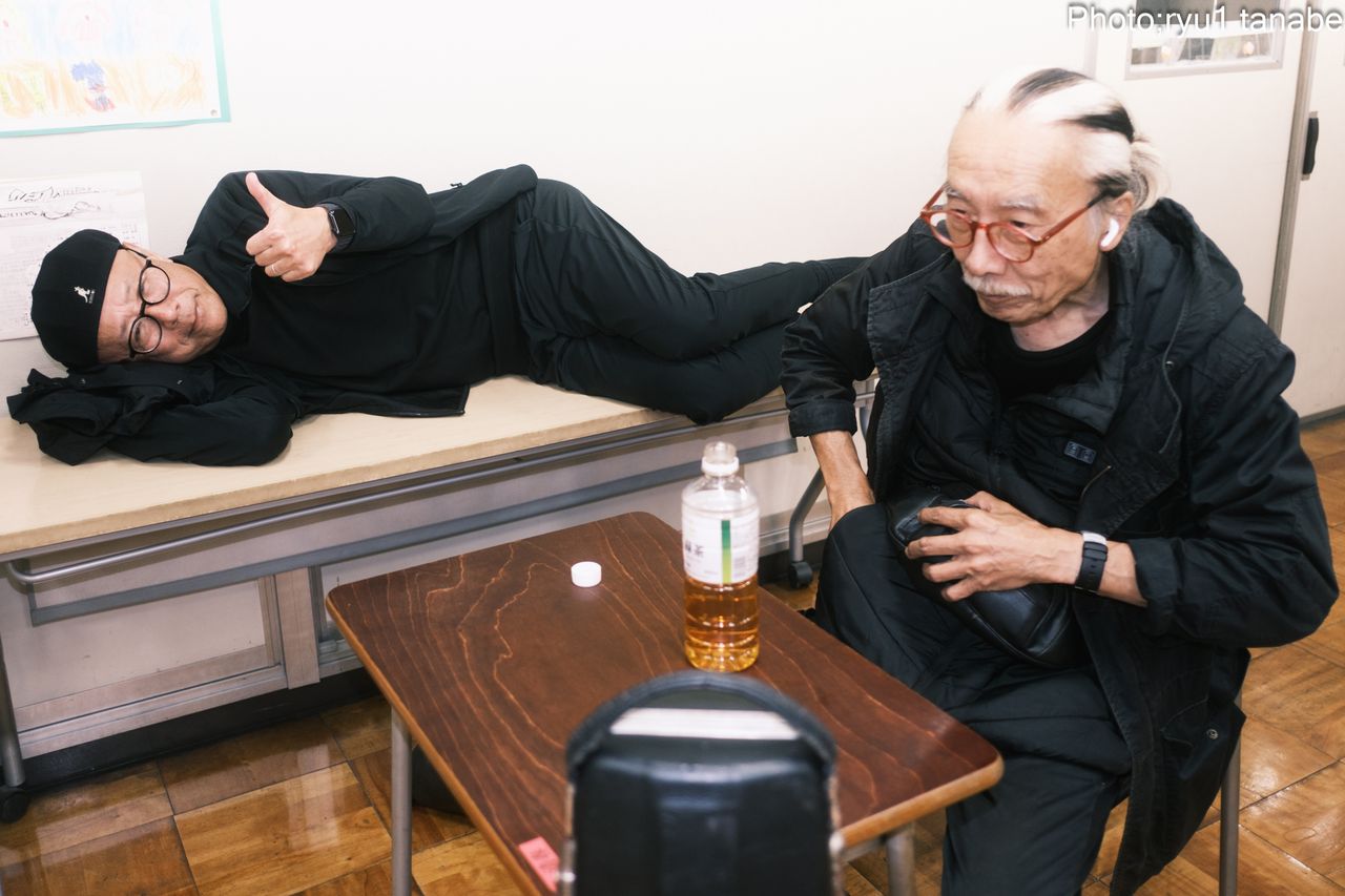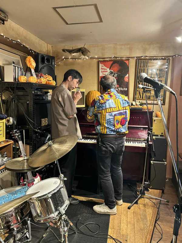 年明け最初のライヴは牧さんの退院を受けて、一ヶ月以上ぶりのレギュラー・メンバーでのBoppers、トリオ+1やもろもろの集まりを入れると一ヶ月に何回も顔を合わせている我々ですが、やけに久々ですので、始まる前から楽屋は居酒屋状態です。