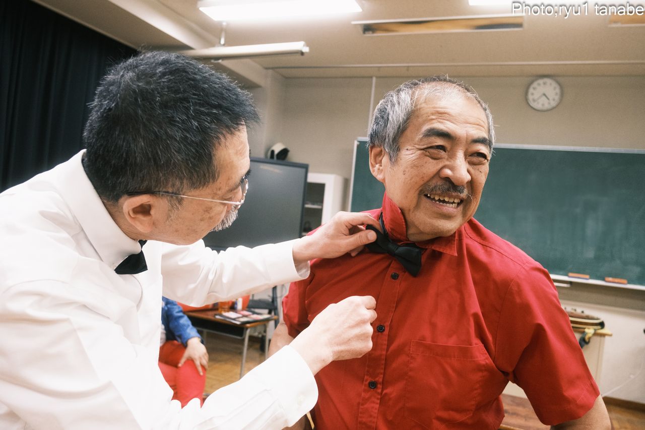 この蝶ネクタイは昨年購入したもので、まだ装着に慣れていないため、鏡を見ずに自分でつけることが出来ません。とりあえず一番近くにいる西川さんにつけ直してもらいました。
