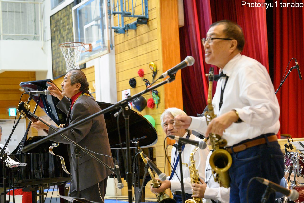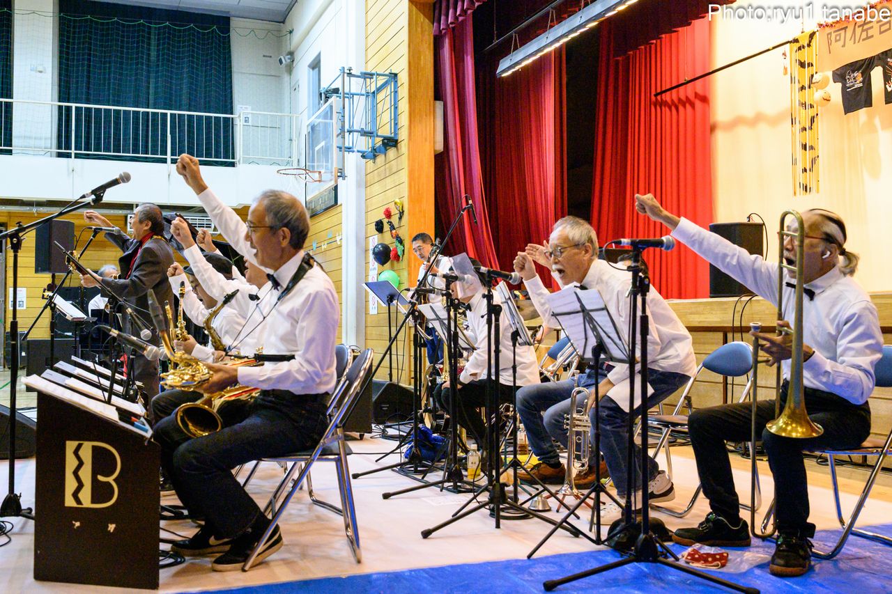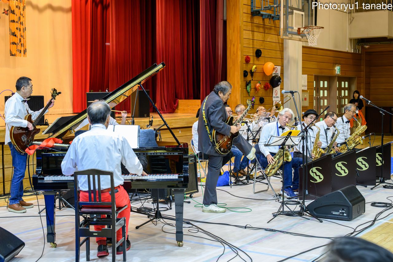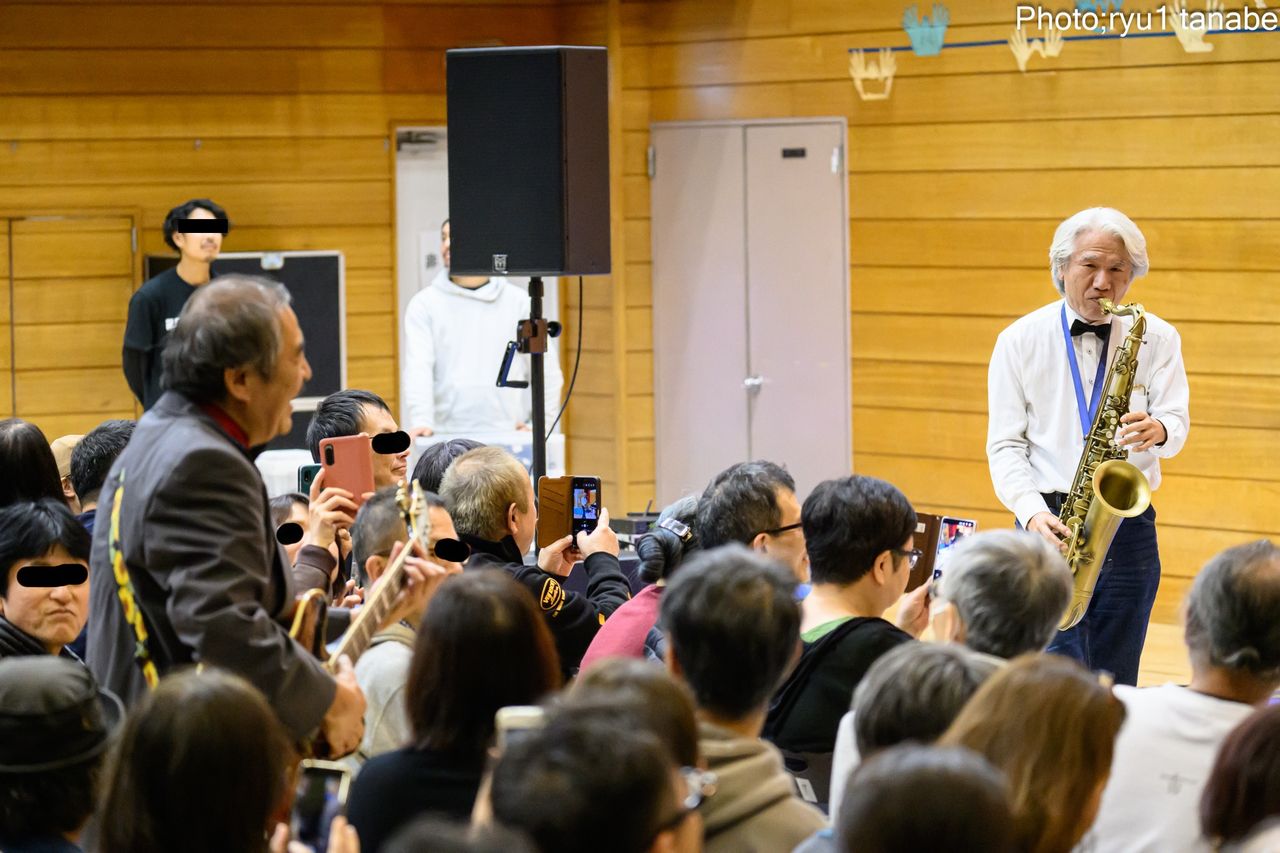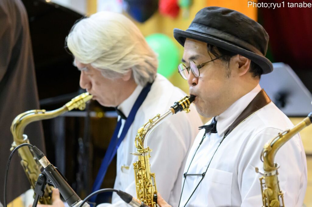 キャブ・キャロウェイの「スカンク・ソング」という曲の日本語訳を綺麗にハモって唄う彼らにはいつも嫉妬を覚えており、この日も誰かの椅子の上に画鋲を置きたくなりました。休憩の後の第二ステージはテナーの浦ニィがワイヤレスで登場、ビッグ・J・マクニーリィの「ディーコンズ・ホップ」で場内暴れ吹きを披露しました。