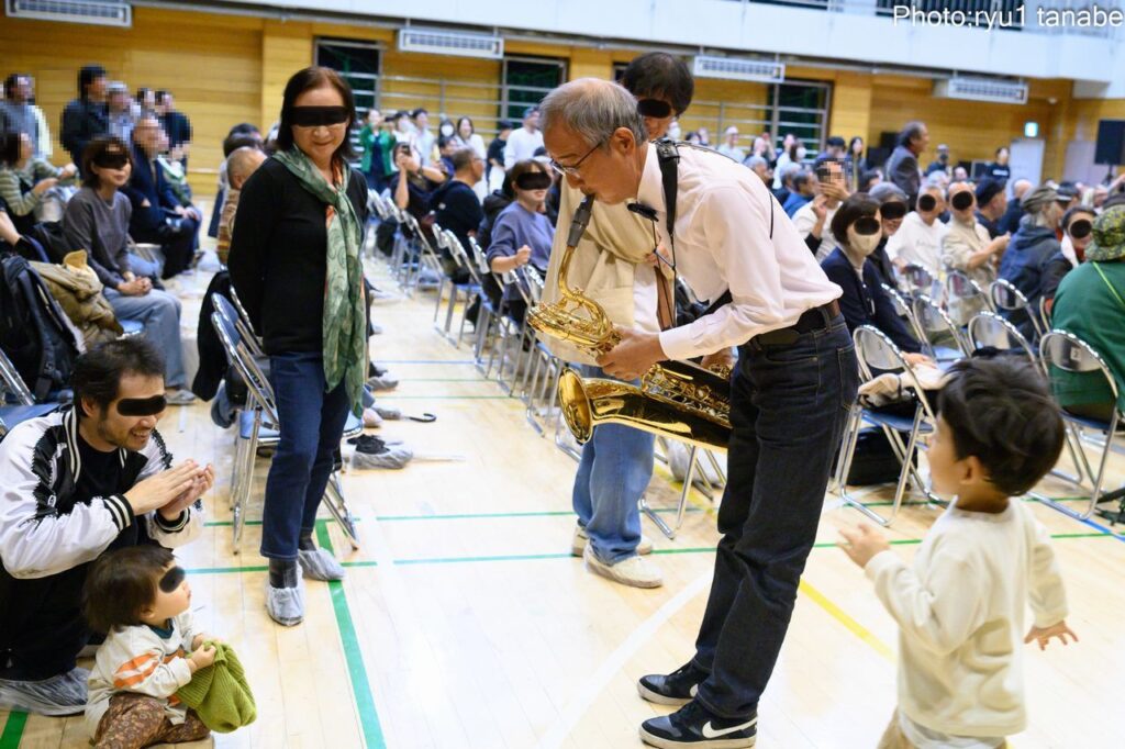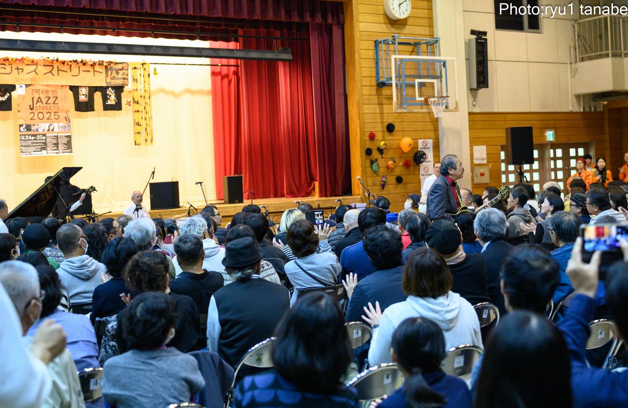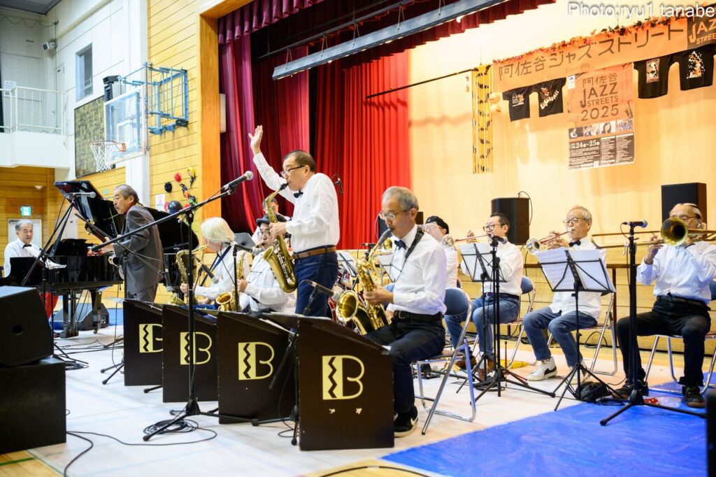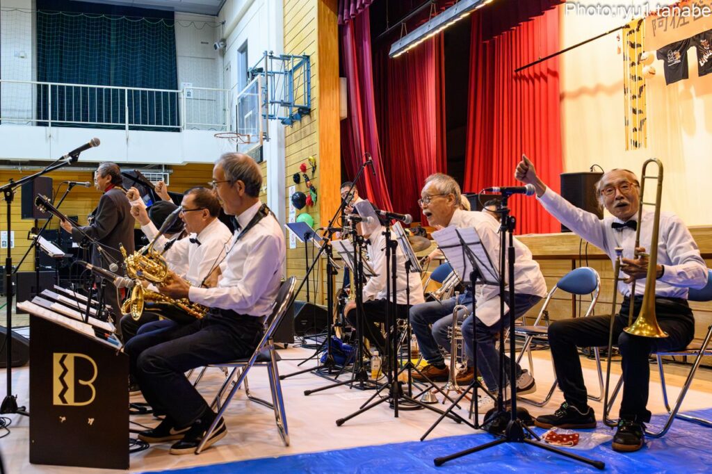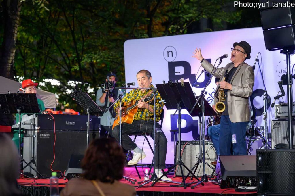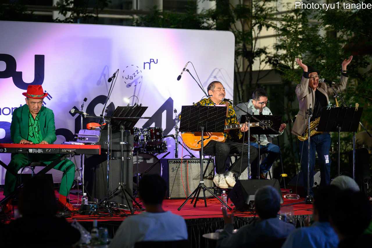 キャブ・キャロウェイの「スカンク・ソング」という曲の日本語訳を綺麗にハモって唄う彼らにはいつも嫉妬を覚えており、この日も誰かの椅子の上に画鋲を置きたくなりました。休憩の後の第二ステージはテナーの浦ニィがワイヤレスで登場、ビッグ・J・マクニーリィの「ディーコンズ・ホップ」で場内暴れ吹きを披露しました。